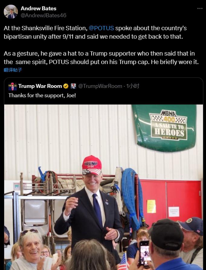 对此,白宫发言人安德鲁 · 贝茨敏捷回应称,拜登在 9 · 11 怀念运动时提到那场劫难后的两党连合,并表现如今的美国应该回到谁人时间。作为一种姿态,他给了现场一位特朗普支持者一顶帽子,随后那位支持者表现,拜登也应该戴上他的特朗普帽子。以是拜登短暂地戴上了它。