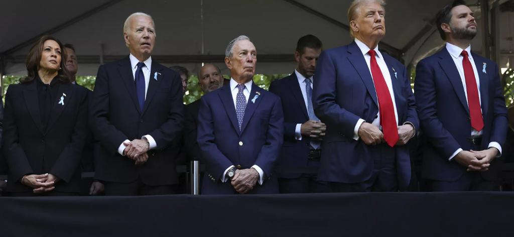 据悉,本地时间周三,美国 9 · 11 国家怀念馆举行年度怀念仪式,美国总统拜登、副总统哈里斯、前总统特朗普和他的竞选搭档万斯一同出席。现场照片表现,前纽约市长布隆伯格站在两人当中。