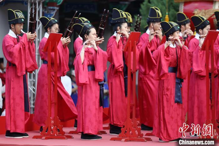 9月28日,台北市各界怀念大成至圣先师孔子诞辰释奠仪式在台北孔庙举行。图为乐生在演奏中。中新社记者 陈小愿 摄